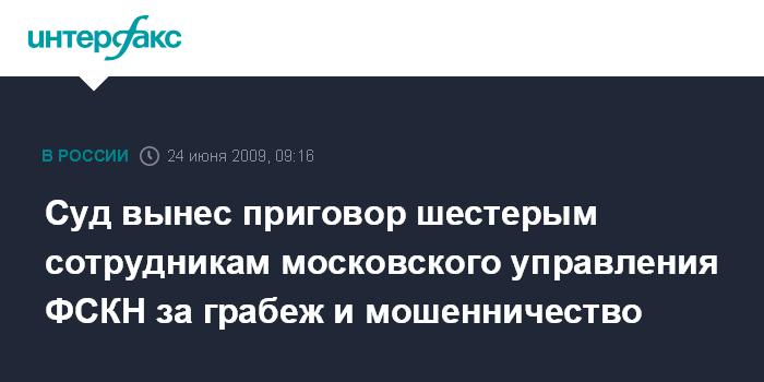 Москва. 24 июня. INTERFAX.RU - Шестеро сотрудников столичного управления Наркоконтроля приговорены к длительным срокам лишения свободы по обвинению в грабеже и мошенничестве.