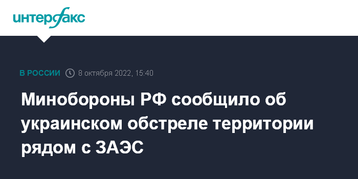 Москва. 8 октября. INTERFAX.RU - Министерство обороны России заявило, что армия Украины снова обстреляла территорию рядом с Запорожской атомной электростанцией (ЗАЭС).