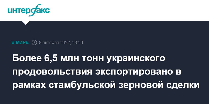 "По состоянию на 8 октября общий тоннаж зерна и другой агропродукции, экспортированных из трех украинских портов, составляет 6 595 784 тонны. Всего на данный момент было разрешено движение 605 судов - 313 на прибытие в украинские порты и 292 - на выход из них", - подчеркивается в сообщении.