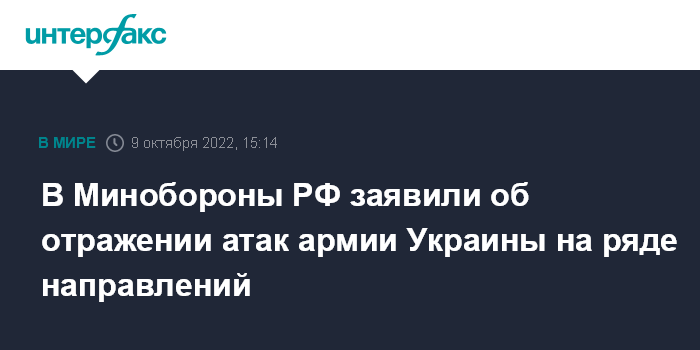 Москва. 9 октября. INTERFAX.RU - Попытки наступления вооружённых сил Украины (ВСУ) на Купянском, Луганском, Запорожском, и Андреевском направлениях отражены, заявил официальный представитель министерства обороны РФ Игорь Конашенков на брифинге.