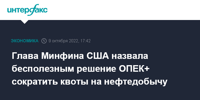 Москва. 9 октября. INTERFAX.RU - Решение ОПЕК+ сократить квоты на нефтедобычу неразумно, неизвестно, какое влияние в конечном итоге оно окажет на мировую экономику, заявила глава американского Минфина Джанет Йеллен в интервью Financial Times.