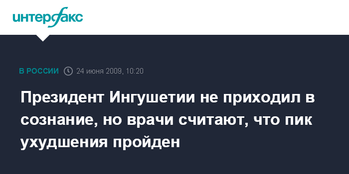 "Угрозы жизни, по словам врачей, нет. Действительно, состояние тяжелое, но говорить об угрозе жизни пока нам не приходится", - сказал пресс-секретарь, отметив, что медики ожидают, что в ближайшие дни состояние президента Ингушетии будет улучшаться.
