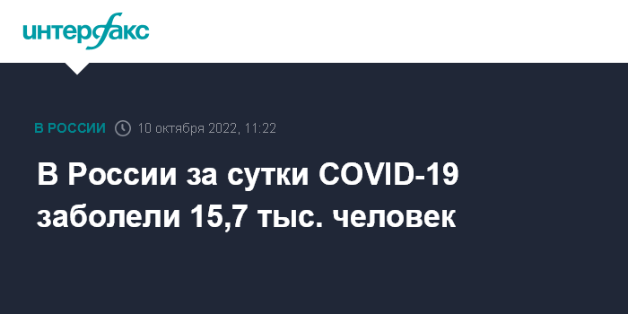 Москва. 10 октября. INTERFAX.RU - Суточный прирост новых заболевших коронавирусом в РФ опустился до значений начала августа и составил почти 15,7 тысячи случаев, скончались 96 пациентов с COVID-19, следует из обнародованных в понедельник данных оперативного штаба.