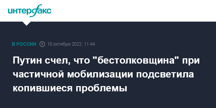 Москва. 10 октября. INTERFAX.RU - В организации частичной мобилизации, объявленной в России, "достаточно бестолковщины", но это хорошая возможность исправить проблемы, которые копились на протяжении длительного времени, заявил президент РФ Владимир Путин.