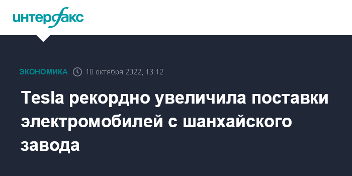 Москва. 10 октября. INTERFAX.RU - Американский производитель электромобилей Tesla Inc. увеличил поставки со своего предприятия в Шанхае в сентябре до рекордного уровня после модернизации завода.