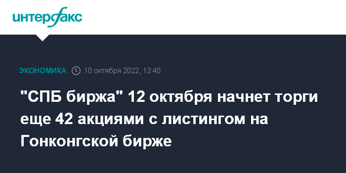Москва. 10 октября. INTERFAX.RU - "СПБ биржа" 12 октября начнет торги еще 42 акциями с листингом на Гонконгской фондовой бирже, сообщает сайт биржи.