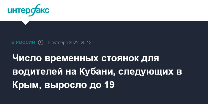 Москва. 10 октября. INTERFAX.RU - Водители, следующие в Крым через паромную переправу и ожидающие своей очереди проезда, могут отдохнуть на 19 временных стоянках на Кубани, сообщили "Интерфаксу" в пресс-службе министерства ГО и ЧС Краснодарского края.