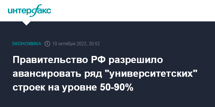 Москва. 10 октября. INTERFAX.RU - Правительство РФ разрешило установить размер аванса на уровне 50-90% от начальной (максимальной) цены контракта (НМЦК) по госконтрактам на капитальное строительство ряда объектов для нужд различных российских университетов. Соответствующее правительственное распоряжение опубликовано на портале правовой информации.
