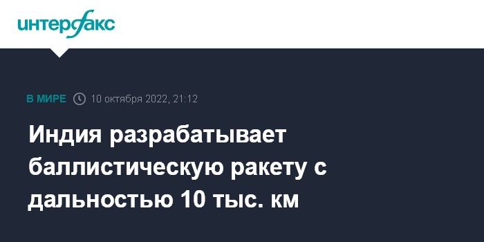 Москва. 10 октября. INTERFAX.RU - Индия разрабатывает и в предстоящие три года готовится испытать новую баллистическую ракету Agni с дальностью действия 10 тыс. км, способную нести ядерный боезаряд, сообщило европейское оборонное издание Army Recognition.