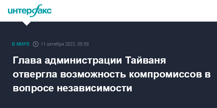 Москва. 11 октября. INTERFAX.RU - Тайвань не пойдет на компромиссы в вопросе своей независимости и суверенитета, заявила глава администрации острова Цай Инвэнь.