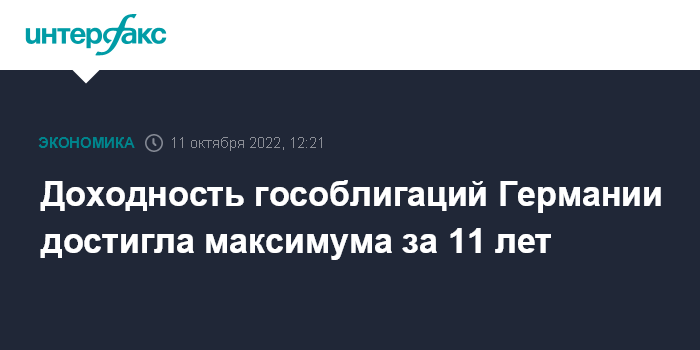 Москва. 11 октября. INTERFAX.RU - Доходность десятилетних гособлигаций Германии выросла 10 октября до 2,346% годовых - максимума с 2011 года - на заявлениях канцлера ФРГ Олафа Шольца и остается близко к этой отметке в ходе торгов во вторник, сообщает MarketWatch.
