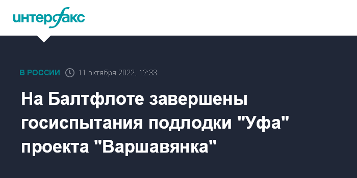 Москва. 11 октября. INTERFAX.RU - В Балтийском море завершились государственные испытания дизель-электрической подлодки "Уфа" проекта 636.3 "Варшавянка", сообщили в пресс-службе Балтфлота во вторник.