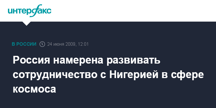 Москва. 24 июня. INTERFAX.RU - Россия планирует подписать в ходе визита президента РФ Дмитрия Медведева 24 июня в Нигерию всеобъемлющий документ по сотрудничеству с нигерийским космическим агентством.