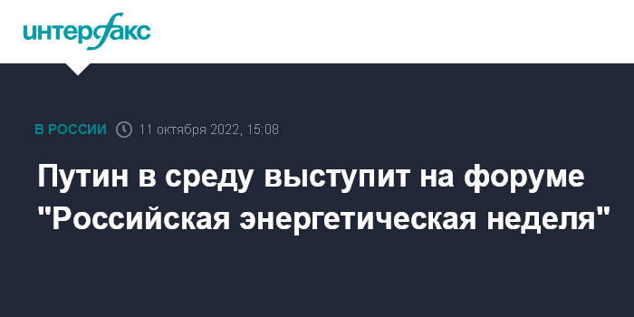 Москва. 11 октября. INTERFAX.RU - Президент России Владимир Путин в среду, 12 октября, выступит на пленарном заседании пятого международного форума "Российская энергетическая неделя", сообщила пресс-служба Кремля.