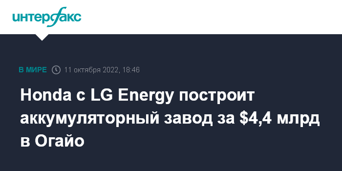 Москва. 11 октября. INTERFAX.RU - Японский автопроизводитель Honda Motor в партнерстве с южнокорейской LG Energy Solution построит завод по производству аккумуляторов для электромобилей за $4,4 млрд в американском штате Огайо.
