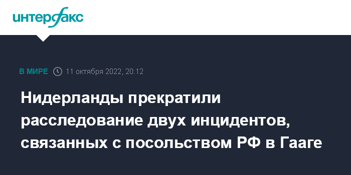 Москва. 11 октября. INTERFAX.RU - Власти Нидерландов проинформировали российскую сторону о прекращении расследования двух инцидентов, связанных с посольством России в Гааге, сообщила официальный представитель МИД РФ Мария Захарова.
