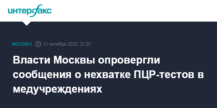"Медицинские организации, подведомственные департаменту здравоохранения Москвы, обеспечены ПЦР-тестами для выявления коронавируса в полном объеме, дефицита нет", - сказал собеседник агентства.