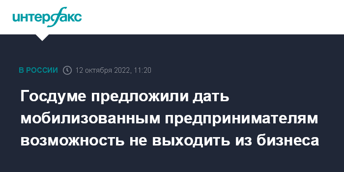 Москва. 12 октября. INTERFAX.RU - В Госдуму внесён проект закона, который позволяет мобилизованным индивидуальным предпринимателям и юрлицам передать свои организации в доверительное управление или сохранить их регистрацию без изменений на время, пока владелец не демобилизуется.