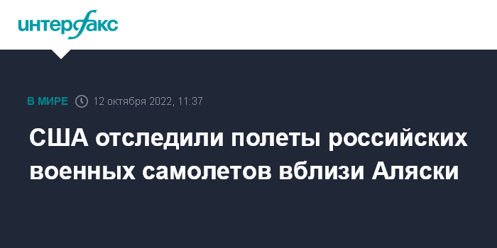 Москва. 12 октября. INTERFAX.RU - Соединенные Штаты зафиксировали, идентифицировали и отследили полеты двух российских патрульных противолодочных самолетов, вошедших в минувшие сутки в зону опознавания ПВО Аляски (ADIZ) и Канады, сообщило Объединенное командование аэрокосмической обороны Северной Америки (NORAD).
