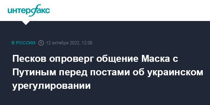 Москва. 12 октября. INTERFAX.RU - Американский предприниматель Илон Маск не общался с президентом России Владимиром Путиным перед тем, как изложил в твиттере свои предложения по украинскому урегулированию, сообщил пресс-секретарь главы российского государства Дмитрий Песков.