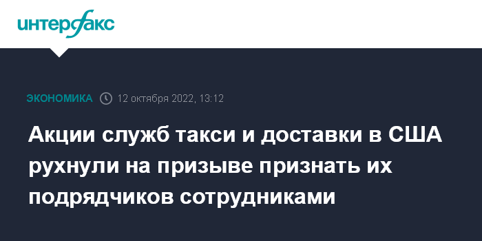 Москва. 12 октября. INTERFAX.RU - Цена бумаг ведущих служб заказа такси и доставки еды в США упала после предложения министерства труда считать доставщиков и таксистов сотрудниками компаний, а не независимыми подрядчиками.
