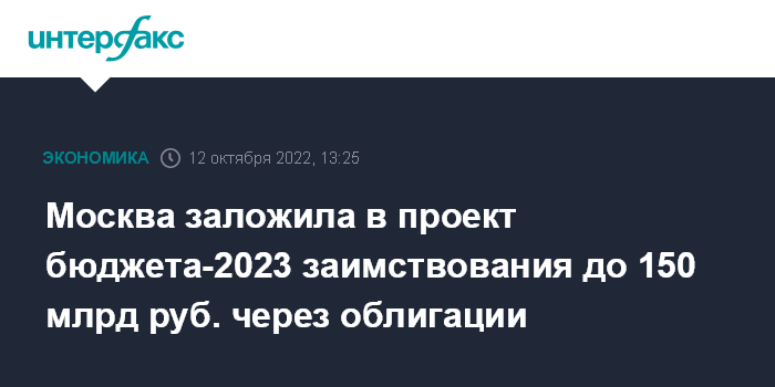 Москва. 12 октября. INTERFAX.RU - Москва закладывает в проект бюджета на 2023 год заимствования через размещение облигаций в размере до 150 млрд руб.