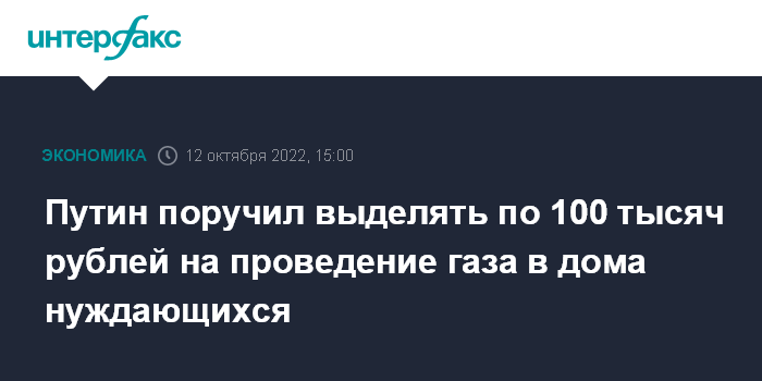 Москва. 12 октября. INTERFAX.RU - Президент Владимир Путин поручил губернаторам предоставить субсидии нуждающимся гражданам в размере 100 тысяч рублей на приобретение газового оборудования. Он сообщил об этом, выступая на "Российской энергетической неделе".