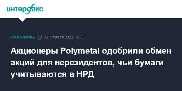 Москва. 12 октября. INTERFAX.RU - Акционеры Polymetal на внеочередном собрании одобрили обмен акций для нерезидентов, чьи бумаги учитываются в Национальном расчетном депозитарии, сообщила компания. Механизм обмена подразумевает перевод акций из электронной формы в документарную.