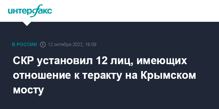 Москва. 12 октября. INTERFAX.RU - Следователи в рамках расследования теракта на Крымском мосту установили 12 подозреваемых в этом преступлении, сообщает в среду телеграм-канал Следственного комитета РФ (СКР).