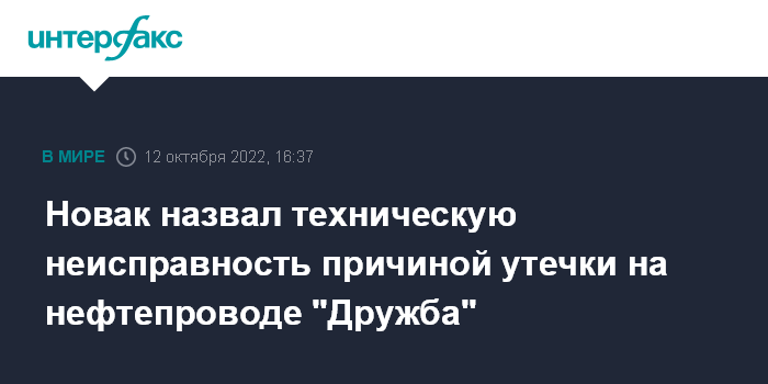 Москва. 12 октября. INTERFAX.RU - Причиной утечки нефти на одной из ниток западного участка трубопровода "Дружба" стала техническая неисправность, которая уже может быть устранена, сообщил журналистам вице-премьер Александр Новак в кулуарах РЭН-2022.