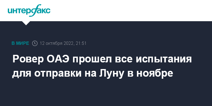 Москва. 12 октября. INTERFAX.RU - Ровер "Рашид" прошел все необходимые испытания для отправки на Луну в ноябре в рамках первой лунной миссии Объединенных Арабских Эмиратов. Об этом сообщил в среду Космический центр имени Мухаммеда бин Рашида (MBRSC).
