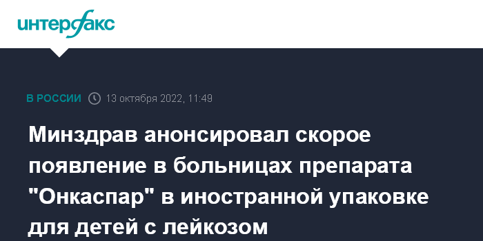 Москва. 13 октября. INTERFAX.RU - В Минздраве России сообщили, что, по данным производителя, препарат "Онкаспар" в иностранной упаковке для оказания экстренной медпомощи детям с острым лимфобластным лейкозозом будет доставлен в медучреждения страны в ближайшее время; он не имеет аналогов в стране.