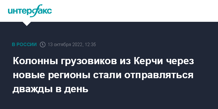 Москва. 13 октября. INTERFAX.RU - Число формируемых ежедневно колонн большегрузов из числа ожидающих очереди на Керченской паромной переправе для проезда в Ростов-на-Дону через новые регионы России с четверга выросло до двух. Об этом сообщил "Интерфаксу" глава администрации Керчи Святослав Брусаков.