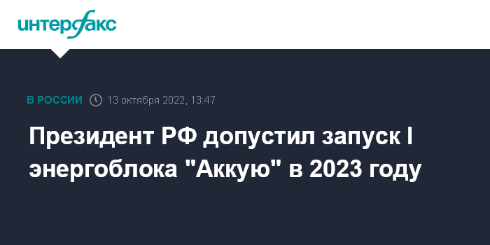 Москва. 13 октября. INTERFAX.RU - Первый энергоблок АЭС "Аккую" может быть запущен к 100-летию Турецкой Республики, заявил президент РФ Владимир Путин.