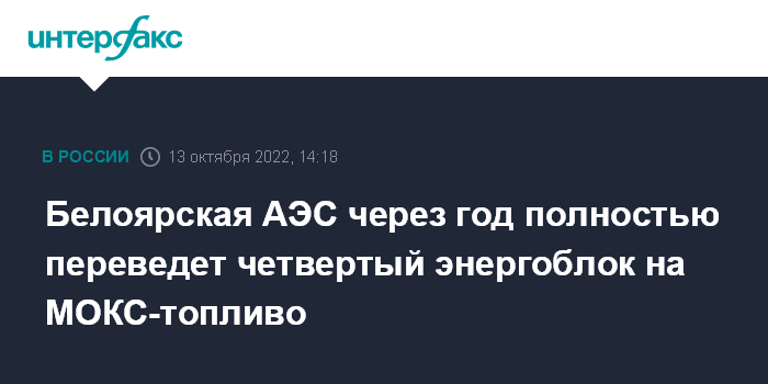 Москва. 13 октября. INTERFAX.RU - Четвертый энергоблок (БН-800) Белоярской атомной электростанции (БАЭС, Свердловская область) получит 100-процентную загрузку уран-плутониевым топливом (МОКС-топливом) до ноября 2023 года. Об этом сообщил директор БАЭС Иван Сидров журналистам в четверг.