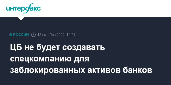 Москва. 13 октября. INTERFAX.RU - Банк России планирует создать специальную компанию, которая по аналогии с банком непрофильных активов возьмет на свой баланс заблокированные из-за санкций активы, говорится в ответах ЦБ, размещенных на сайте Ассоциации банков России (АБР).