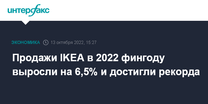 Москва. 13 октября. INTERFAX.RU - Шведский ритейлер IKEA (Inter IKEA Group) зафиксировал рекордный объем продаж по итогам 2022 финансового года, несмотря на проблемы в мировых цепочках поставок и быстро растущие расходы.