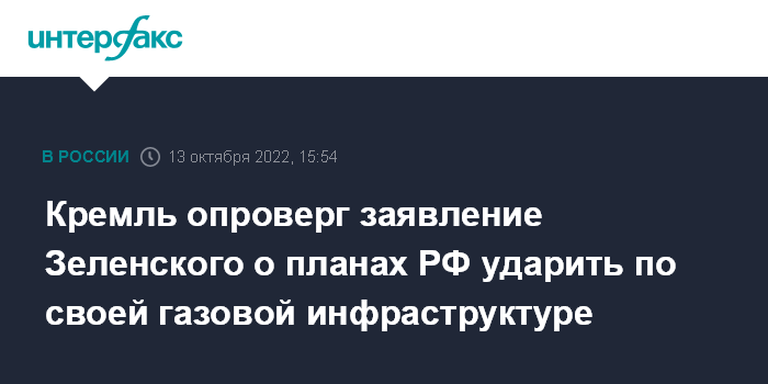 Москва. 13 октября. INTERFAX.RU - Пресс-секретарь президента РФ Дмитрий Песков отверг заявление президента Украины Владимира Зеленского о том, что Россия якобы планирует удары по своей газовой инфраструктуре.