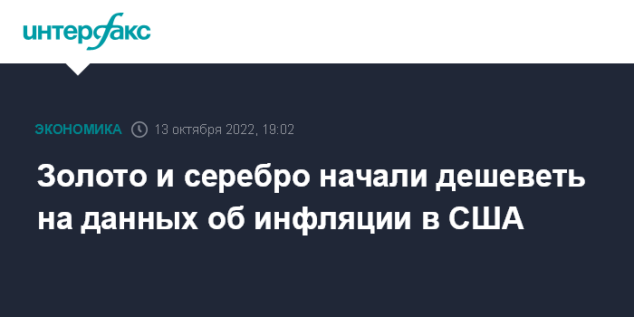 Москва. 13 октября. INTERFAX.RU - Цены на золото и серебро снижаются в ходе торгов в четверг после того, как данные Минтруда США укаазали на лишь незначительное замедление инфляции.