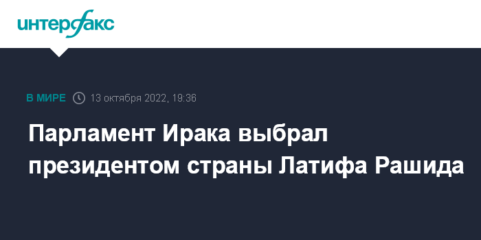 Москва. 13 октября. INTERFAX.RU - Парламент Ирака выбрал президентом страны Латифа Рашида, за него проголосовали 162 депутата, за его оппонента, экс-президента Бархама Салеха, 63, сообщает Rudaw.