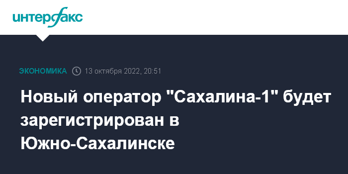 Москва. 13 октября. INTERFAX.RU - Новый оператор реализуемого на условиях соглашения о разделе продукции проекта "Сахалин-1" ООО "Сахалин-1" (на английском языке - Sakhalin-1 LLC) будет зарегистрирован в Южно-Сахалинске, говорится в распоряжении правительства от 12 октября.