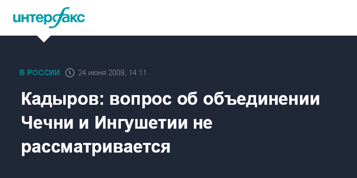 Москва. 24 июня. INTERFAX.RU - Руководство Чечни и Ингушетии не ставит вопрос об объединении республик в единый субъект федерации, заявил президент Чеченской республики Рамзан Кадыров.