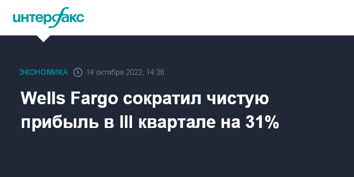 Москва. 14 октября. INTERFAX.RU - В III квартале 2022 года Wells Fargo & Co., лидер рынка ипотечного кредитования и второй по капитализации банк США, сократил чистую прибыль на 31%, увеличив выручку на 4%.