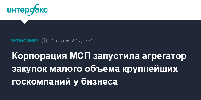 Москва. 14 октября. INTERFAX.RU - "Корпорация МСП" запустила агрегатор закупок малого объема (ЗМО) крупнейших госкомпаний у субъектов малого и среднего предпринимательства (МСП), следует из сообщения корпорации.