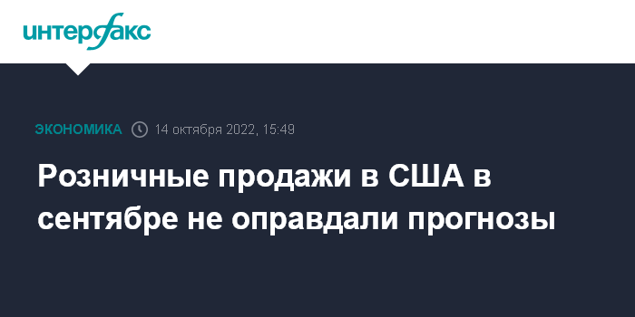 Москва. 14 октября. INTERFAX.RU - В сентябре 2022 года рРозничные продажи в США в сентябре не изменились относительно предыдущего месяца, сообщило Министерство торговли страны.