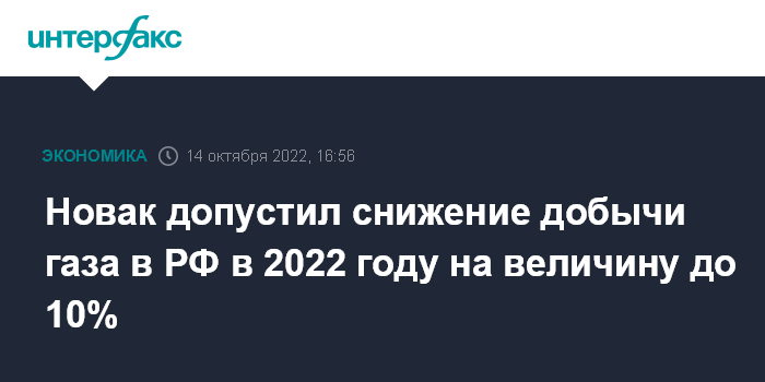 Москва. 14 октября. INTERFAX.RU - Добыча газа в России в 2022 году может снизиться на величину до 10%, сообщил журналистам вице-премьер РФ Александр Новак в кулуарах "Российской энергетической недели".