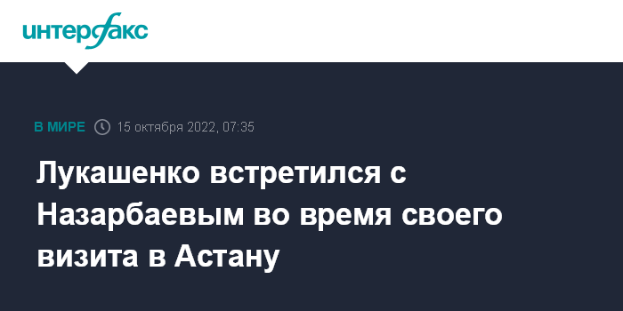 Москва. 15 октября. INTERFAX.RU - Президент Белоруссии Александр Лукашенко во время своего визита в Астану побывал в гостях у первого президента Казахстана Нурсултана Назарбаева.