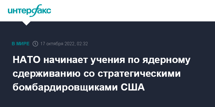 Москва. 17 октября. INTERFAX.RU - ВВС стран-членов НАТО в понедельник начинают ежегодные учения Steadfast Noon ("Стойкий полдень") по ядерному сдерживанию, сообщает Североатлантический альянс.
