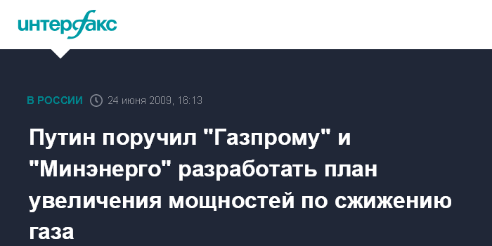 Москва. 24 июня. INTERFAX.RU - Премьер-министр РФ Владимир Путин считает необходимым увеличить мощности России по сжижению газа. Как заявил В.Путин в среду на встрече с руководством компании НОВАТЭК и французской Total, я дал поручение "Газпрому", министерству энергетики России разработать план по увеличению мощностей по сжижению газа. По словам премьера, это даст возможность не только диверсифицировать рынки, но и увеличить поставки, а также подтолкнет развитие судостроения и других отраслей.