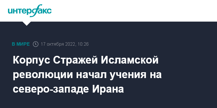 Москва. 17 октября. INTERFAX.RU - Сухопутные войска Корпуса Стражей Исламской революции (КСИР) проводят масштабные учения на северо-западе Ирана в провинции Восточный Азербайджан, сообщает в понедельник "Мехр".